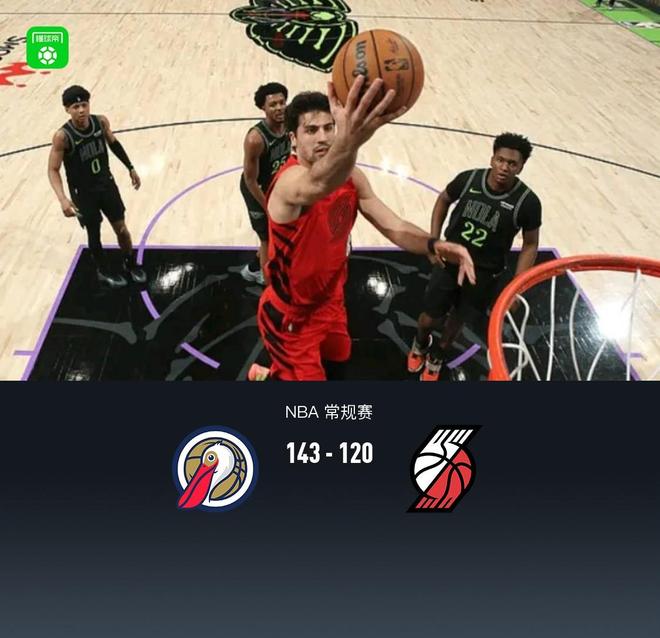 北京时间12月12日的NBA常规赛中,新奥尔良鹈鹕队对阵波特兰开拓者队。本场比赛,开拓者队的三名内线克林根、洛维、杨汉森缺席。里斯的出场时间有限,开拓者队长期使用五小阵容。开拓者队打满整场比赛,并在前三节将分差缩小到个位数。最后一节,开拓者队彻底崩溃。最终,鹈鹕队143-120开拓者队。新奥尔良鹈鹕队特雷·墨菲24分5篮板4助攻,麦克温斯23分7篮板2助攻;波特兰开拓者队的谢登夏普得到21分、3个篮板和3次助攻,西迪·西索科得到20分、4个篮板和2次助攻。第一节,鹈鹕队普尔拿下8分,开拓者队的西迪·西索科拿下7分。首节结束,鹈鹕队39-30领先开拓者队。在第二个第三节,鹈鹕队菲尔斯拿下10分,开拓者队鲁珀特拿下12分。半场结束,鹈鹕队70-68领先开拓者队。第三节,鹈鹕队特雷·墨菲拿下8分,开拓者队谢尔顿·夏普拿下9分。第三节结束,鹈鹕队105-97领先开拓者队。第四节,鹈鹕队的麦格雷戈·温茨得到10分,开拓者队的卡莱布·洛夫得到9分。最终,鹈鹕队以143-120击败开拓者队。完整的游戏数据。新奥尔良鹈鹕队特雷·墨菲得到24分、5个篮板、4次助攻和3次抢断。麦克温斯23分7篮板2助攻2抢断。普尔得到22分、1篮板、3助攻和1抢断。波特兰开拓者队的谢登·夏普得到21分、3个篮板、3次助攻和1次盖帽。西迪·西索科得到20分、4个篮板、2次助攻和1次盖帽。格兰特得到16分、5个篮板和1次助攻。新奥尔良鹈鹕队首发阵容:特雷·墨菲、菲尔斯、德里克·奎恩、萨迪克·贝、赫伯特·琼斯;港口陆地开拓者队:谢登·夏普、格兰特、阿夫迪亚、卡马拉、克里斯·穆雷。